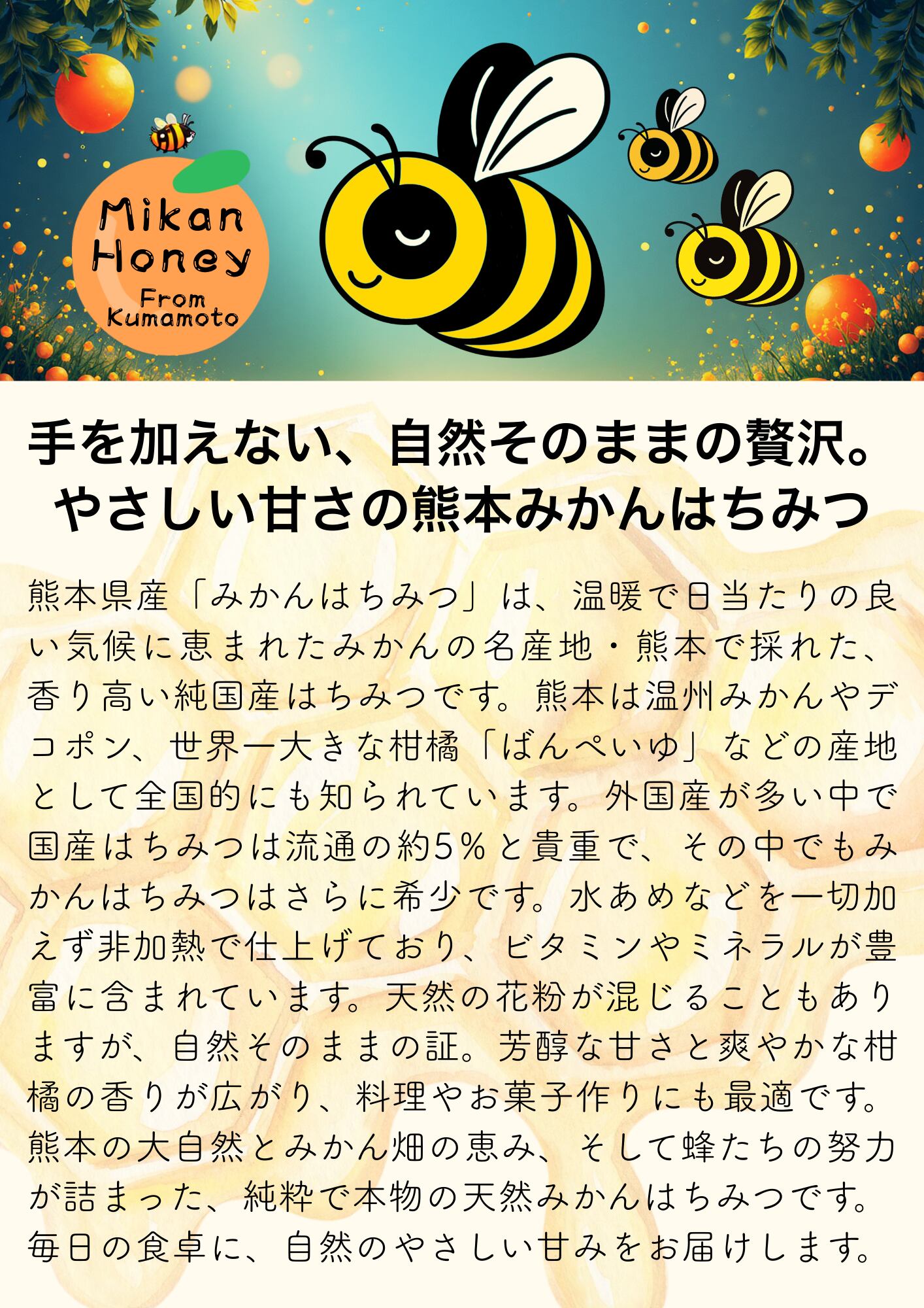 熊本の自然の恵みから生まれた、みかんの花から採蜜した純粋100%の国産はちみつです。